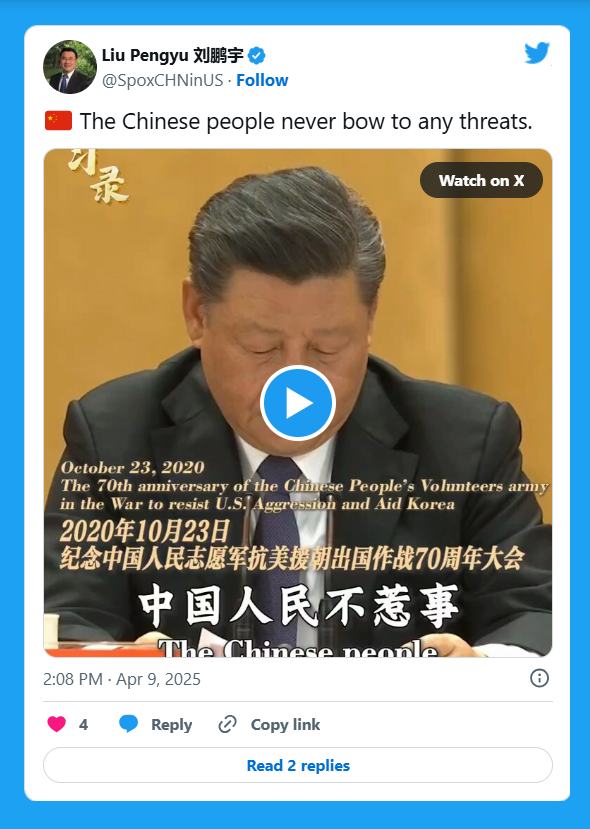 In a sign of how seriously China is taking the prospect of a trade war, an official compared Chinas resolvealbeit indirectlyto that shown during armed conflict. On April 9, Liu Pengyu, spokesperson for the Chinese embassy in Washington, shared a video of Chinese President Xi Jinping solemnly saying that intimidation or pressure will never work on the Chinese nation, a clip from a speech that Xi gave in 2020 on the occasion of the seventieth anniversary of Chinas entry into the Korean War (official Chinese name: The War to Resist US Aggression and Aid Korea).